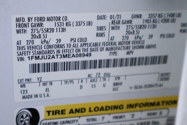 Expedition Limited, Ford Blue Certified Certified, 4D Sport Utility, EcoBoost 3.5L V6 GTDi DOHC 24V Twin Turbocharged, 10-Speed Automatic, 4WD, Oxford White, Medium Stone Leather, 12 Speakers, 3.31 Axle Ratio, 3rd row seats: split-bench, 4-Wheel Disc Brakes, ABS brakes, Adjustable pedals, Air Conditioning, Alloy wheels, AM/FM radio: SiriusXM, Auto High-beam Headlights, Auto-dimming door mirrors, Auto-dimming Rear-View mirror, Automatic temperature control, Brake assist, Bumpers: body-color, Compass, Delay-off headlights, Driver door bin, Driver vanity mirror, Dual front impact airbags, Dual front side impact airbags, Electronic Stability Control, Emergency communication system: SYNC 3 911 Assist, Exterior Parking Camera Rear, Four wheel independent suspension, Front anti-roll bar, Front Bucket Seats, Front Center Armrest, Front dual zone A/C, Front fog lights, Front reading lights, Fully automatic headlights, Garage door transmitter, Heated & Ventilated Leather Front Captain's Chairs, Heated door mirrors, Heated front seats, Heated rear seats, Heated steering wheel, Illuminated entry, Leather steering wheel, Low tire pressure warning, Memory seat, Navigation System, Occupant sensing airbag, Outside temperature display, Overhead airbag, Overhead console, Panic alarm, Passenger door bin, Passenger vanity mirror, Pedal memory, Power door mirrors, Power driver seat, Power Liftgate, Power passenger seat, Power steering, Power windows, Radio data system, Radio: B&O Sound System by Bang & Olufsen, Rain sensing wipers, Rear air conditioning, Rear anti-roll bar, Rear audio controls, Rear reading lights, Rear window defroster, Rear window wiper, Reclining 3rd row seat, Remote keyless entry, Roof rack: rails only, Security system, SiriusXM Satellite Radio, Speed control, Speed-sensing steering, Speed-Sensitive Wipers, Split folding rear seat, Steering wheel memory, Steering wheel mounted audio controls, SYNC 3 Communications & Entertainment System, Tachometer, Telescoping steering wheel, Tilt steering wheel, Traction control, Trip computer, Turn signal indicator mirrors, Variably intermittent wipers, Ventilated front seats, Voltmeter, and Wheels: 20 Premium Dark Tarnish-Painted.