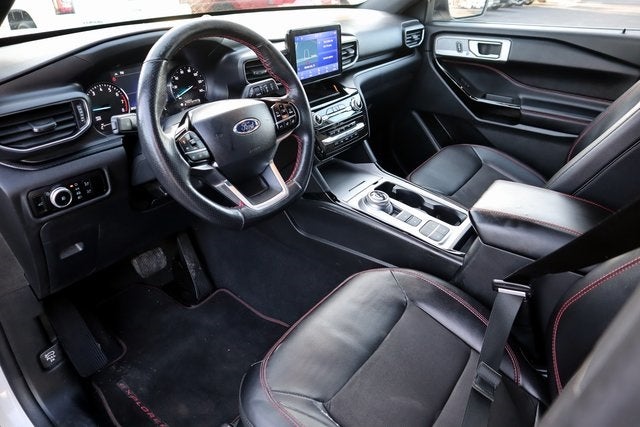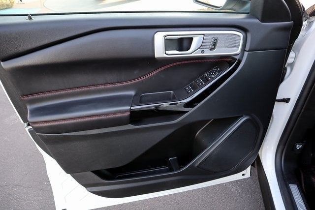 Backup Camera/ Rearview Camera, Bluetooth®, Collision Avoidance System, Collision Warning Alert System, Blind Spot Monitors, Heated Seats, Lane Keeping Assist, Apple Carplay/ Android Auto, Adaptive Headlights, Keyless Access, Push Button Start, Automatic Headlghts, Voice Recognition, Smartphone App Integration, USB Port, Aux Input, Remote Start, Leather Seats, 3rd Row Seats/ Third Row Seats, Sirius XM Radio, Parking Sensors, Tow Package, Alloy Wheels, ____CAR GURUS____, Aluminum Wheels, Climate Package, Explorer ST-Line, 4D Sport Utility, 2.3L EcoBoost I-4, 10-Speed Automatic, RWD, Star White Metallic Tri-Coat, Ebony Leather, 12 Speakers, 3.58 Non-Limited-Slip Rear Axle Ratio, 3rd row seats: bench, 4-Wheel Disc Brakes, 4G LTE Wi-Fi Hotspot Credit, ABS brakes, Air Conditioning, Alloy wheels, AM/FM radio: SiriusXM, Auto High-beam Headlights, Auto Start-Stop Removal (DISC), Auto-dimming Rear-View mirror, Automatic temperature control, Brake assist, Bumpers: body-color, Class IV Trailer Tow Package, Compass, Delay-off headlights, Driver door bin, Driver vanity mirror, Dual front impact airbags, Dual front side impact airbags, Electronic Stability Control, Emergency communication system: SYNC 3 911 Assist, Equipment Group 250A, Exterior Parking Camera Rear, FordPass Connect, Four wheel independent suspension, Front anti-roll bar, Front Bucket Seats, Front Center Armrest, Front dual zone A/C, Front fog lights, Front reading lights, Fully automatic headlights, Heated door mirrors, Heated front seats, Heated steering wheel, Htd ActiveX Trimmed Captain's Chairs w/Miko Insert, Illuminated entry, Knee airbag, Leather steering wheel, Low tire pressure warning, Navigation System, Occupant sensing airbag, Outside temperature display, Overhead airbag, Overhead console, Panic alarm, Passenger door bin, Passenger vanity mirror, Power door mirrors, Power driver seat, Power Liftgate, Power passenger seat, Power steering, Power windows, Radio data system, Radio: B&O Sound System by Bang & Olufsen, Rain sensing wipers, Rear air conditioning, Rear anti-roll bar, Rear reading lights, Rear window defroster, Rear window wiper, Remote keyless entry, Security system, Speed control, Speed-sensing steering, Speed-Sensitive Wipers, Split folding rear seat, Spoiler, Steering wheel mounted audio controls, SYNC 3 Communications & Entertainment System, SYNC 3/Apple CarPlay/Android Auto, Tachometer, Telescoping steering wheel, Tilt steering wheel, Traction control, Trip computer, Variably intermittent wipers, Voice-Activated Touchscreen Navigation System, Wheels: 21 Aluminum.