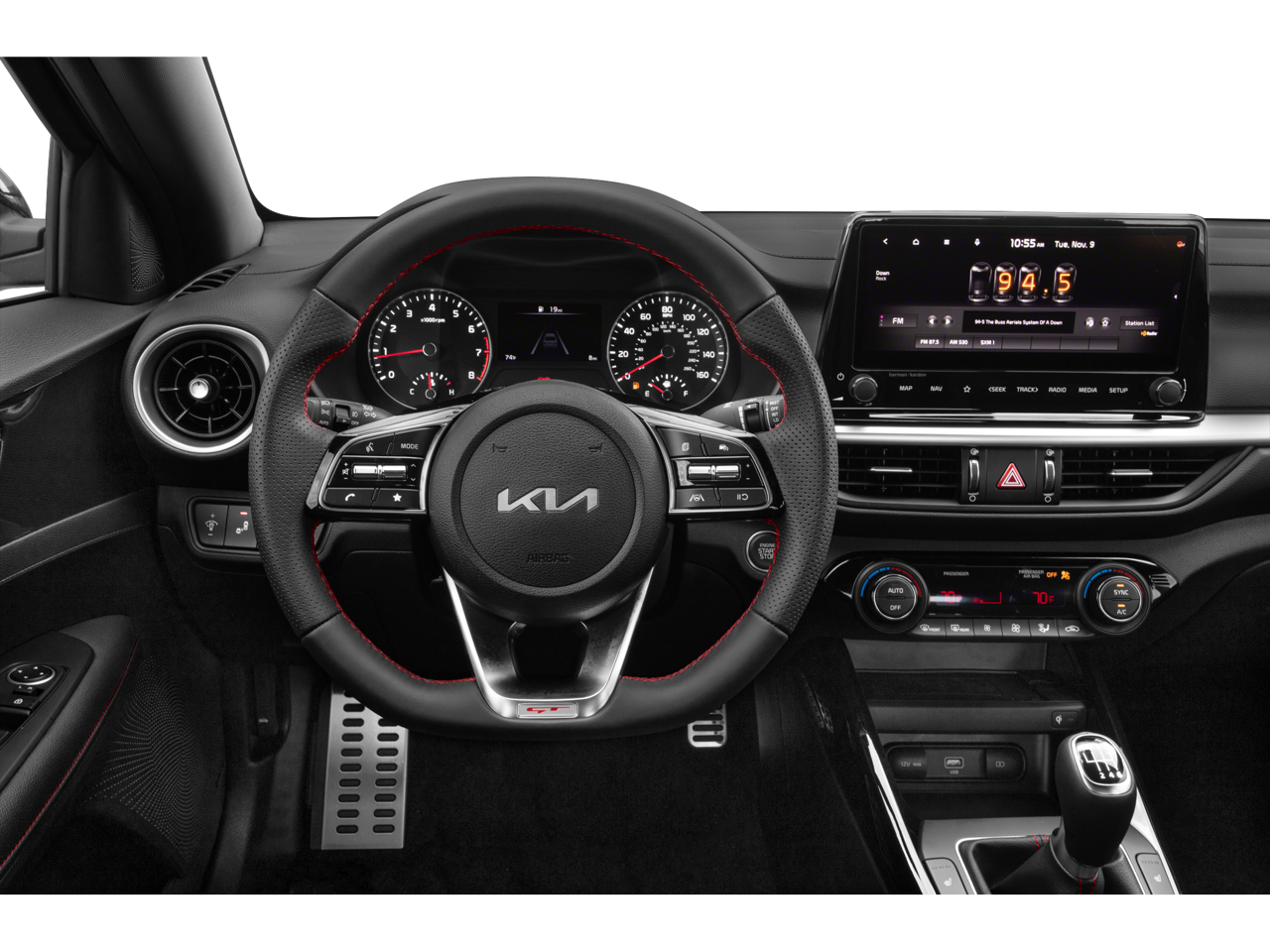 Forte GT, 4D Sedan, 1.6L I4 Turbo, 6-Speed Manual, FWD, Sporty Blue, Black Cloth, 18 x 7.5J Alloy Wheels, 4-Wheel Disc Brakes, 8 Speakers, ABS brakes, Air Conditioning, Alloy wheels, AM/FM radio: SiriusXM, Apple CarPlay & Android Auto, Auto High-beam Headlights, Automatic temperature control, Brake assist, Bumpers: body-color, Delay-off headlights, Driver door bin, Driver vanity mirror, Dual front impact airbags, Dual front side impact airbags, Electronic Stability Control, Emergency communication system, Exterior Parking Camera Rear, Four wheel independent suspension, Front anti-roll bar, Front Bucket Seats, Front Center Armrest, Front dual zone A/C, Front fog lights, Front reading lights, Fully automatic headlights, harman/kardon® Speakers, Heated door mirrors, Heated Front Bucket Seats, Heated front seats, Illuminated entry, Leather Shift Knob, Leather steering wheel, Low tire pressure warning, Navigation System, Occupant sensing airbag, Outside temperature display, Overhead airbag, Overhead console, Panic alarm, Passenger door bin, Passenger vanity mirror, Power door mirrors, Power moonroof, Power steering, Power windows, Radio data system, Radio: harman kardon Premium Audio, Rear anti-roll bar, Rear reading lights, Rear seat center armrest, Rear window defroster, Remote keyless entry, Security system, Speed control, Split folding rear seat, Spoiler, Sport steering wheel, Steering wheel mounted audio controls, SynTex Seat Trim, Tachometer, Telescoping steering wheel, Tilt steering wheel, Traction control, Trip computer, Turn signal indicator mirrors, and Variably intermittent wipers.