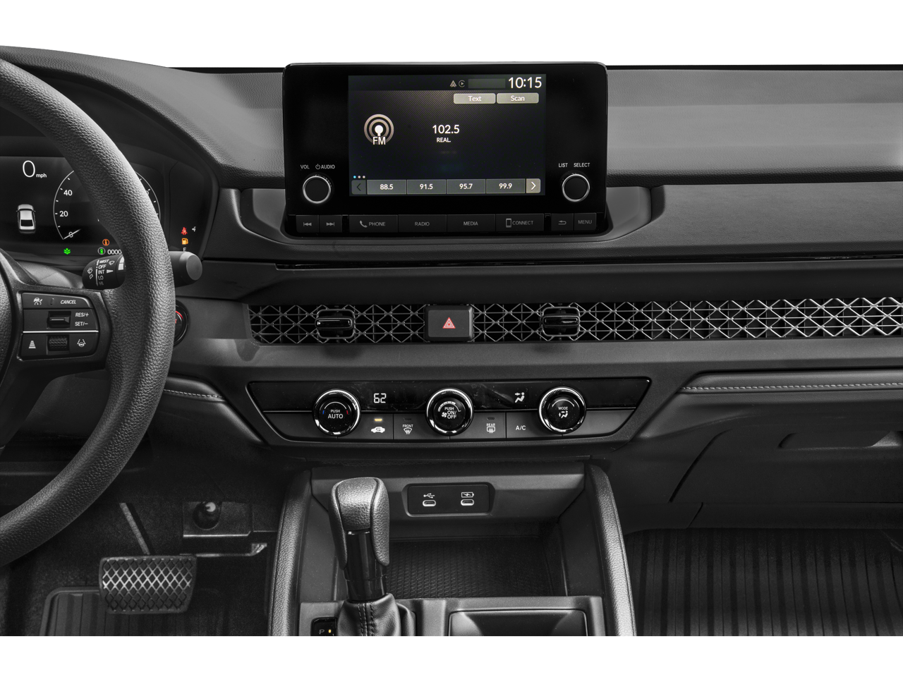 Gray w/Fabric Seat Trim, Alloy wheels, Wheels: 17 x 7.5 Blade Silver, 4 Speakers, 4-Wheel Disc Brakes, ABS brakes, Adaptive Cruise Control: Adaptive Cruise Control (ACC) with Low-Speed Follow, Air Conditioning, AM/FM radio, Apple CarPlay/Android Auto, Auto High-beam Headlights, Automatic temperature control, Brake assist, Bumpers: body-color, Compass, Delay-off headlights, Driver door bin, Driver vanity mirror, Dual front impact airbags, Dual front side impact airbags, Electronic Stability Control, Emergency communication system: HondaLink Assist, Exterior Parking Camera Rear, Fabric Seat Trim, Four wheel independent suspension, Front anti-roll bar, Front Bucket Seats, Front Center Armrest, Front reading lights, Fully automatic headlights, Illuminated entry, Knee airbag, Lane departure: Lane Keeping Assist System (LKAS) active, Low tire pressure warning, Occupant sensing airbag, Outside temperature display, Overhead airbag, Overhead console, Panic alarm, Passenger door bin, Passenger vanity mirror, Power door mirrors, Power steering, Power windows, Radio data system, Radio: 160-Watt AM/FM Audio System, Rear anti-roll bar, Rear reading lights, Rear seat center armrest, Rear side impact airbag, Rear window defroster, Remote keyless entry, Security system, Speed control, Speed-sensing steering, Speed-Sensitive Wipers, Steering wheel mounted audio controls, Tachometer, Telescoping steering wheel, Tilt steering wheel, Traction control, Trip computer, and Variably intermittent wipers.